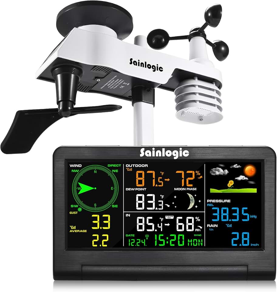 Sainlogic Weather Station Wireless Indoor Outdoor with Color Display, Weather Station with Rain Gauge and Wind Speed/Direction, Temperature, Humidity, Air Pressure, Forecast, Moon Phase, and Alarm