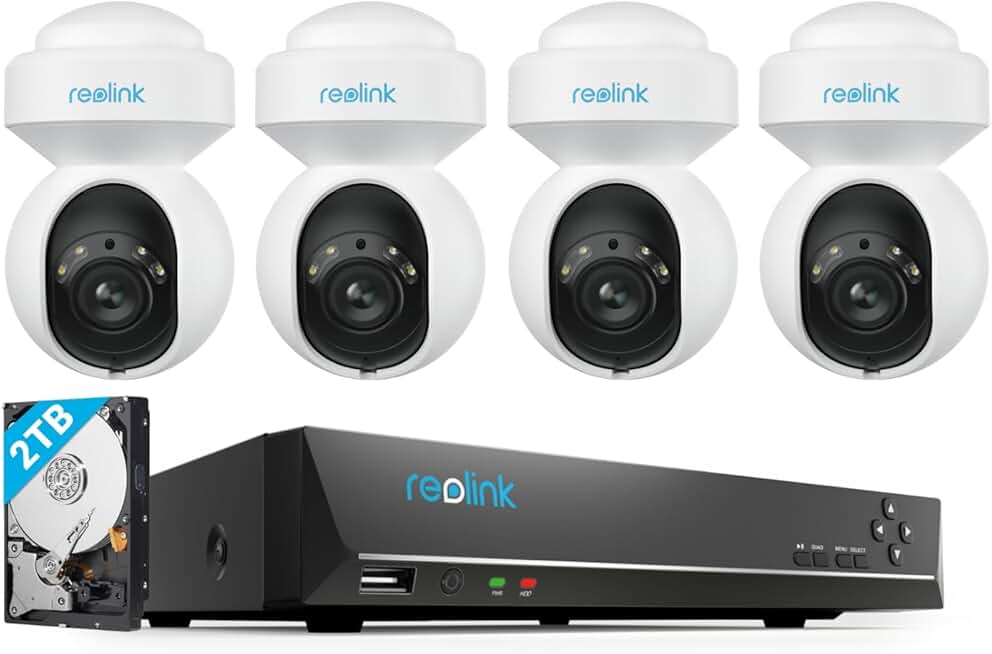 REOLINK 4K PTZ Surveillance System, 4X E1 Outdoor PoE IP Security Cameras Bundle with 8CH NVR RLN8-410, Secure 24/7 Local Storage, Auto-Tracking, Color Night Vision, Smart Detection, Two Way Talk