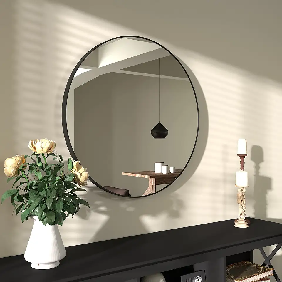 B&C 32 inch Round Mirror with 1.54" Matte Black Aluminum Frame, Stylish Circle Mirror for Vanity Make Up, Circular Mirror for Bathroom/entryway/Bedroom/livingroom/Vanity Room/Rustic Home décor