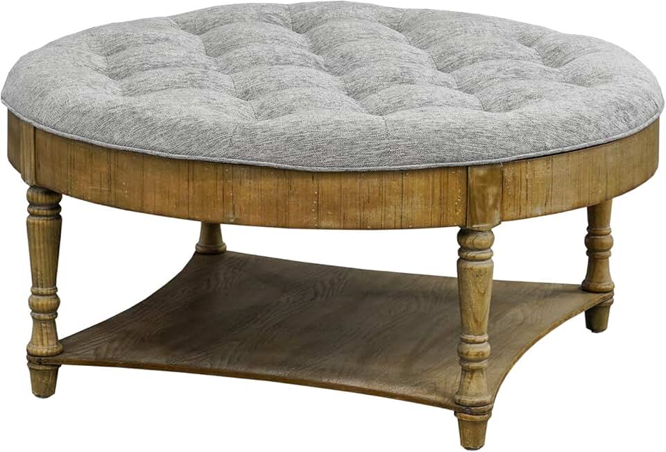IVANE Round Ottoman Coffee Table with Storage Tray, Top Upholstered Button Tufted and Solid Wood Legs with Lower Shelf for Living Room (Grey)