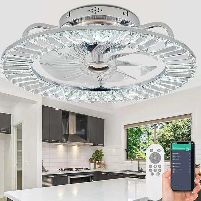 Crystal Low Profile Ceiling Fan with Light - Modern Flush Mount Enclosed Ceiling Fan 20" LED Dimmable Ceiling Fans with Remote Control,Smart 3 Light Color and 6 speeds
