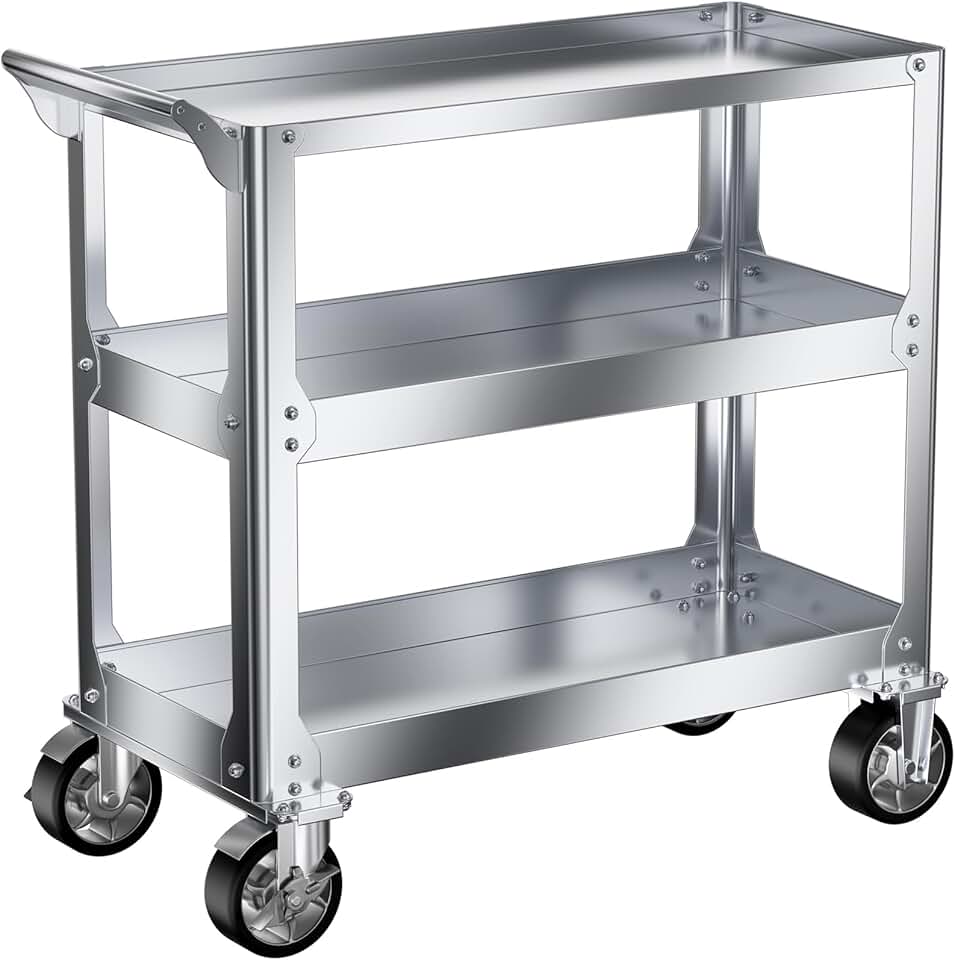 DDJ Stainless Steel Utility Cart on Wheels, 3-Tier 1100 lbs Heavy Duty Tool Cart with Wheels, Commercial Rolling Service Cart for Garage Workshop Warehouse Mechanic Kitchen 18.1" D x 30.7" W x 36.2" H