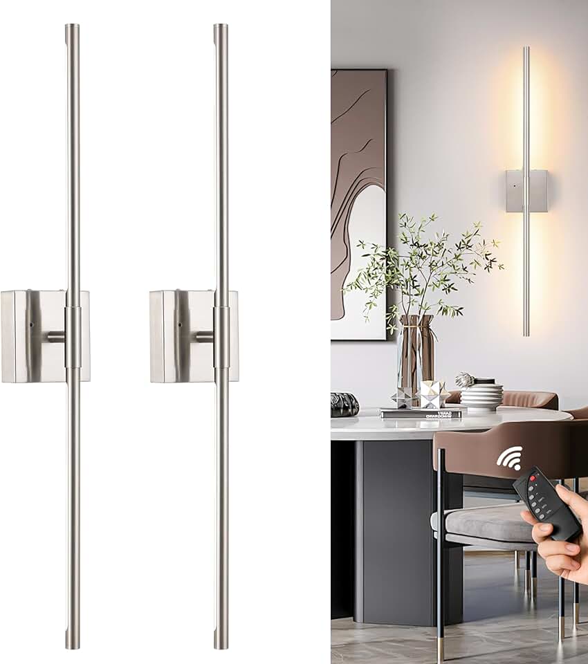 Sand-Nickel Battery Operated Wall Sconces Set of Two, Dimmable Wall Sconces with Remote Control, Rechargeable Sconces, 24 Inch LED Wireless Wall Lights for Bedroom, Living Room, Bathroom