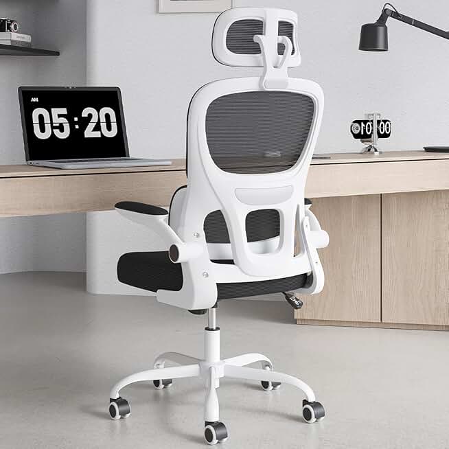 Soohow Ergonomic Home Office Chair, Mesh Desk Chair with Lumbar Support, Comfy Computer Desk Chair with Flip Armrest Rolling Wheels, Adjustable Headrest, White.