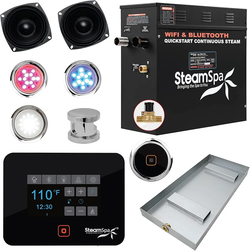 SteamSpa Raven Series WiFi and Bluetooth 6kW QuickStart Steam Bath Generator Package Polished Chrome | Touch Screen WiFi App Control Steam Shower Kit with Drain pan and Speakers | FG-RVB600CH-A