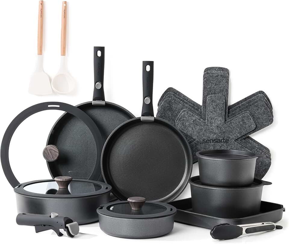 SENSARTE 24 Piece Pots and Pans Set, Nonstick Detachable Handle Cookware, Induction Kitchen Cookware Set with Removable Handle, Healthy Non Stick RV Cookware, Dishwasher&Oven Safe, PFOA Free (Black)