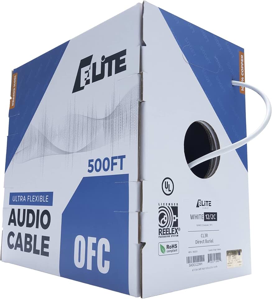 Elite 12/2 Speaker Wire, 12AWG/2-Conductor, UL Listed, CMR/CL3R, (Riser/in-Wall & Outdoor/In-Ground (Direct Burial)- 100% Oxygen Free Pure Bare Copper (OFC), 500ft Bulk Cable (65 Strands) White