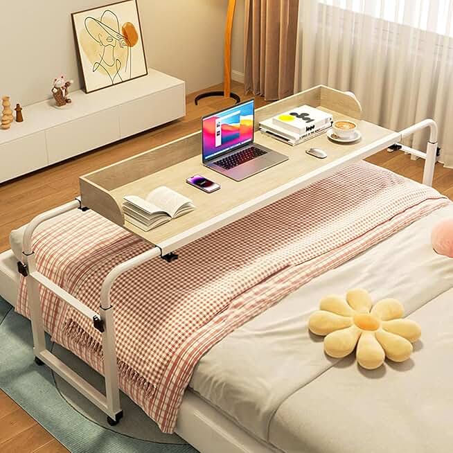 Overbed Table Wheels Overbed Table with Wheels, Height Adjustable 65-95Cm Computer Desk Standing Workstation Food Tray Desk Rolling Table for Home and Twin/Full/Queen/King Size Bed Frame(Col