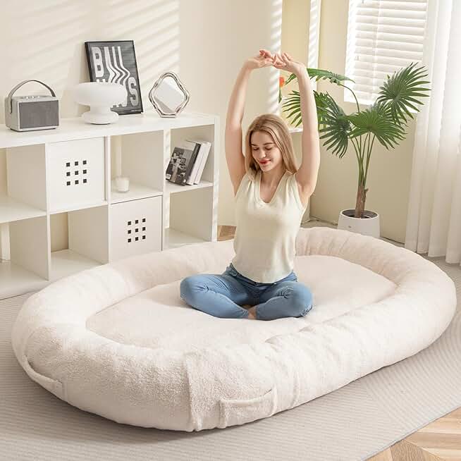 HIGOGOGO Giant Dog Bed for Human, 74"x46"x12" Dog Bed for Humans Size Fits You and Pets, Sherpa Giant Floor Bed with Machine Washable Cover, XXXL Bean Bag Bed for Adult and Pets, Beige
