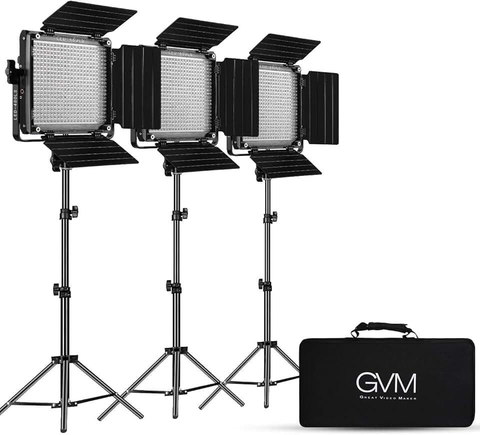 GVM 3 Pack LED Video Lighting Kits, Bi-Color Variable 2300K~6800K with Digital Display, 10~100% Brightness, CRI97+ TLCI97 Led Video Light Panel, Barndoor, App Control