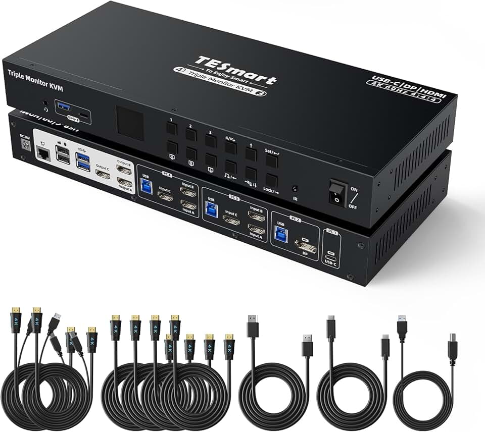 TESmart USB 3.0 HDMI+DP+USB C KVM Switch 3 Monitors 4 Computers 4K@60Hz, 4 Port Triple Monitor KVM Switch Built-in Docking Station, Headset,MST, EDID emulators, Hotkey Switch, Wired Network, Rack-Ears