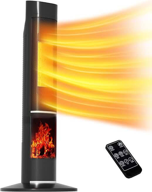 Uthfy 32" Space Heater for Large Room, 1500W Portable Tower Heater With Flame for Indoor Use, Electric Ceramic Heater With Thermostat, Remote, 80° Oscillation, 24 H Timer, 3 Modes, for Office, Bedroom