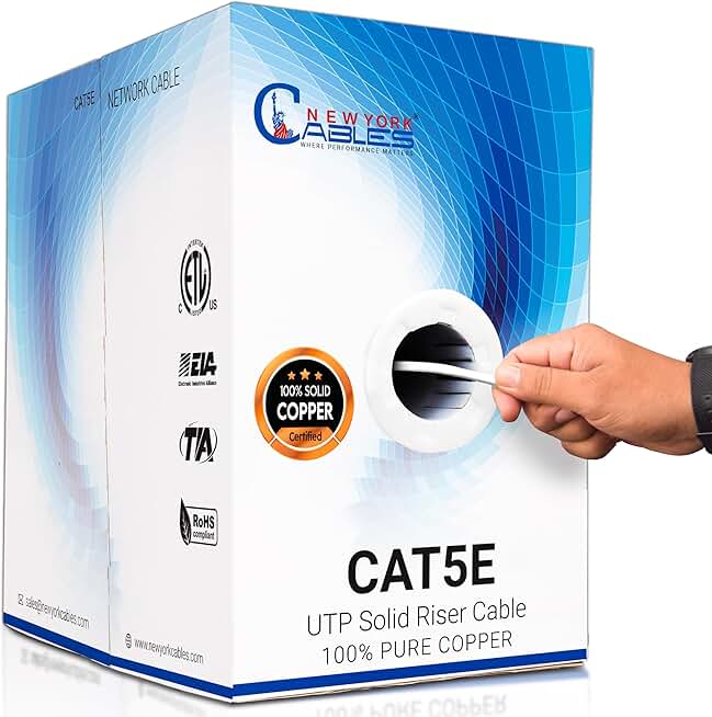 NewYork Cables Cat5e Ethernet Cable 1000ft - ETL Listed Cat5e Riser (CMR) Solid Bare Copper - 24AWG, 350MHz, PoE++ (4PPoE), UTP Cat 5 Ethernet Cable - High Speed Easy Pull Box Cat5e Cable 1000ft