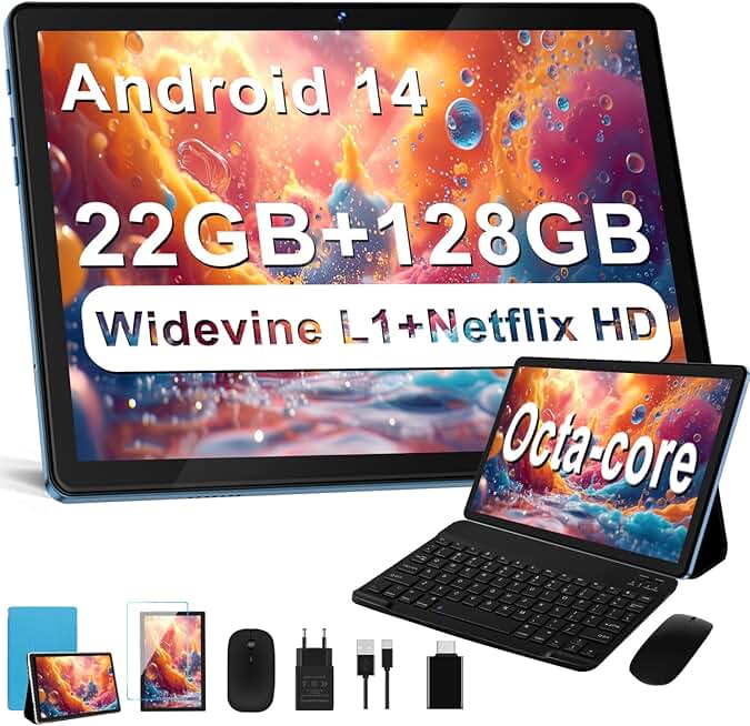 2024 Newest Android 14 Tablet, 22G+128G/1TB Expansion, 10 inch Tablets with 8000 mAh Battery, Octa-Core, GPS, Split-Screen, Face Unlock, 2 in 1 Tablet with Keyboard, Mouse, Case, Metal Blue