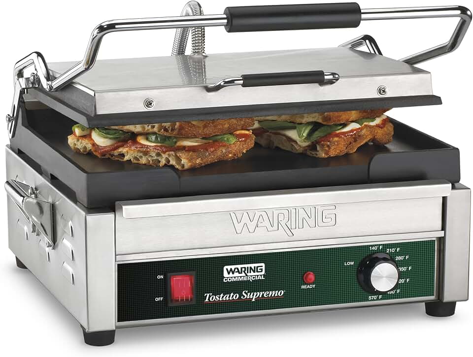 Waring Commercial WFG250 Tostato Supremo® Large Flat Toasting Grill, 120V, 1800W, 5-15 Phase Plug, Silver