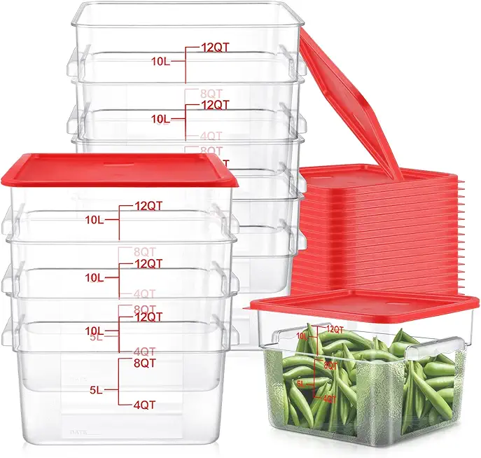 8 Pack Polycarbonate Square Food Storage Container with Red Lids 12 Qt Food Storage Containers Commercial Airtight Clear Bucket Brining Food Container