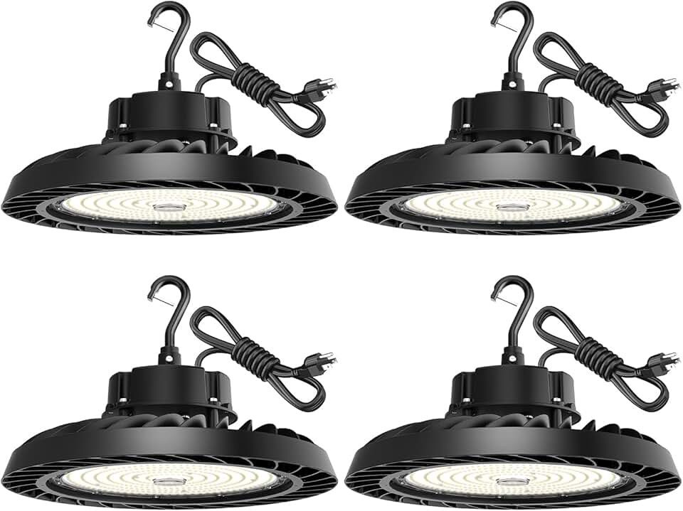 UFO LED High Bay Light 200W 4 Pack, High Bay LED Light 30,000LM (150LM/W) 1-10V Dimmable, 5' Cable with Plug, Hanging Hook, Safe Rope, ETL Listed High Bay Light for Factory Warehouse Workshop