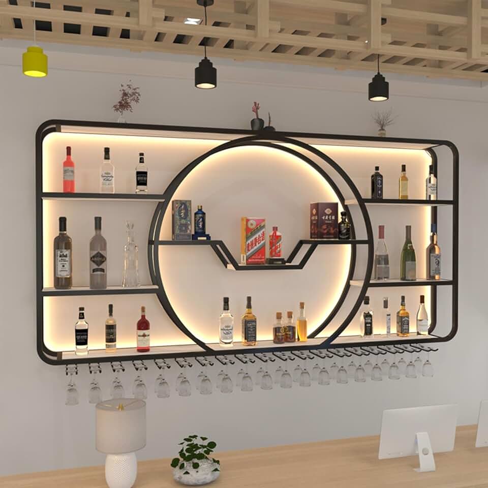 3-Tiers Metal Wine Rack Wall Mounted Modern With LED Light With Wine Glass Holder Large Liquor Bar Display Shelf,Bar Bottle Display Shelf Wine Cups Hanging Holder For Kitchen Living Room Home Decor(Bl