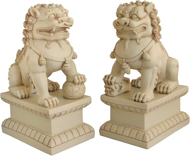 Cultural Element Asian Foo Dogs Garden Pair Statue with Stone Finish | Pair of Two Guardian Lions | Garden Decor | Indoor Outdoor Placement | Show Piece | Feng Shui Decor