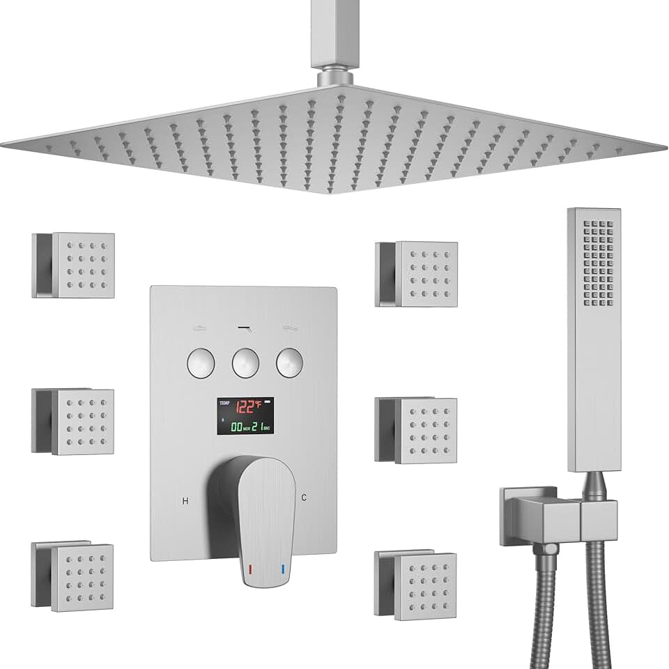Shower Faucet Set Brushed Nickel Shower System with 12 Inches Rain Shower Head and Shower Body Jet Handheld Sprayer Ceiling Shower Fixture Set with Brass Temperature Display Shower Valve