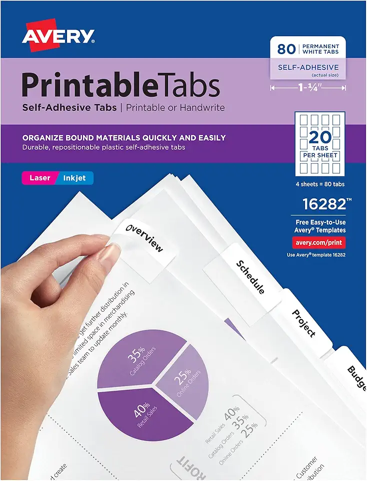 Avery Printable Self-Adhesive Plastic Tabs, 1-3/4", Repositionable Adhesive, Packs of 80, White, 24 Packs, 1,920 Total Tabs (16282)
