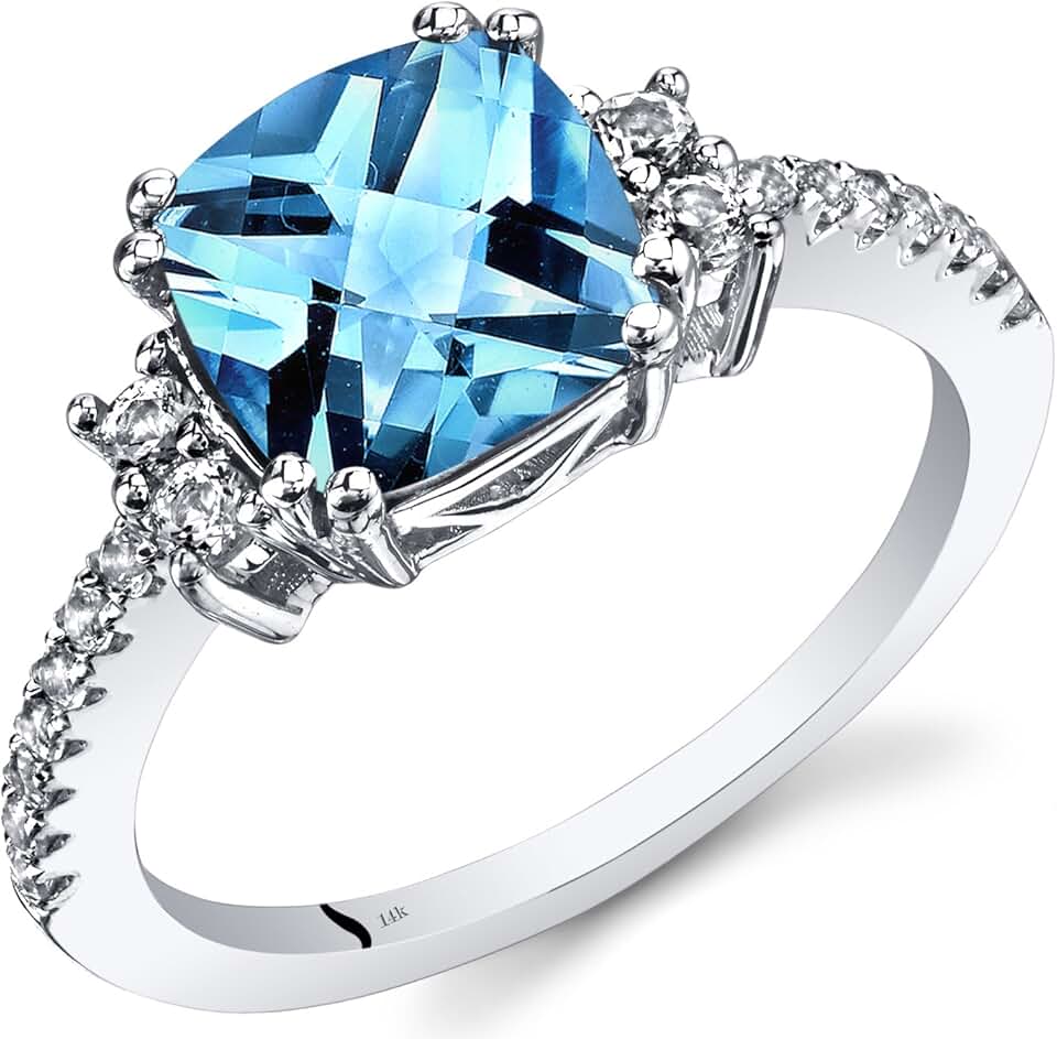 PEORA Swiss Blue Topaz Ring for Women 14K White Gold with White Topaz, Natural Gemstone Birthstone, Designer 2.50 Carats Cushion Cut 8mm, Comfort Fit, Sizes 5 to 9