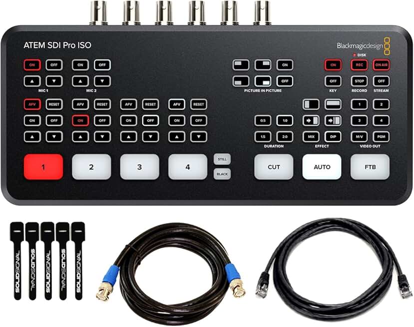Blackmagic Design ATEM SDI Pro ISO Live Stream Switcher Bundle with 8’ 6G-SDI Cable, 7’ Cat5e Cable, and 5-Pack of SolidSignal Cable Ties (SWATEMMXEPBPRISO)