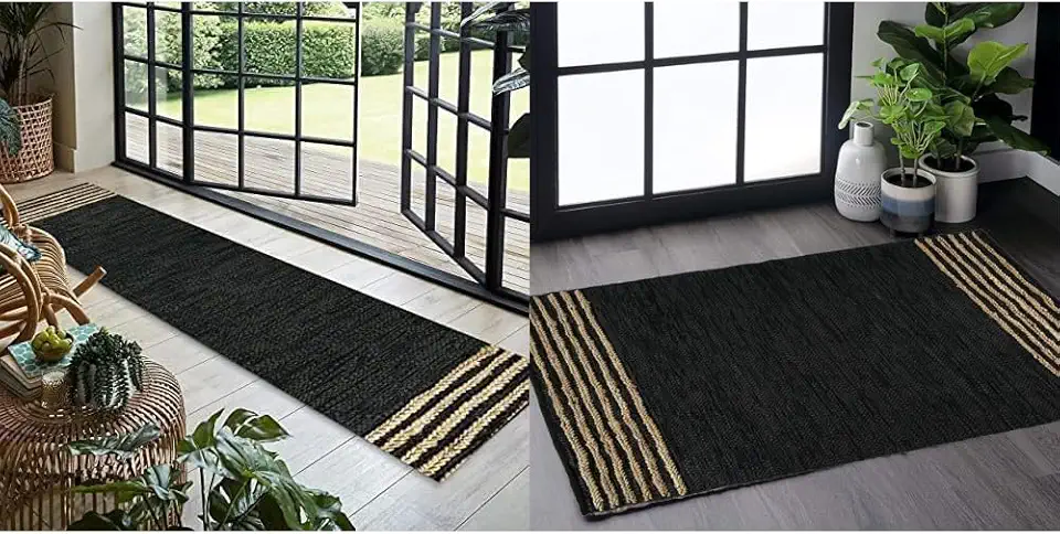 GRUHUM Jute Area Rug 6x9ft- Natural Fibre Black Rectangular Leather Handwoven Jute Runner Rug 2'6"x 6'ft Boho Farmhouse Braided Rustic Vintage EcoFriendly Kitchen Livingroom Bedroom Hallways Enterways