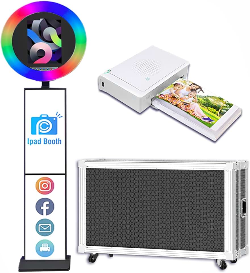 Portable Photo Booth Compatible with Any Ipad,Custom Logo Ipad Photo Booth for Christmas Wedding Party Shell Stand Remote Control Ring Light,Flight Case (Black, iPad Photo Booth+Mini Printer)