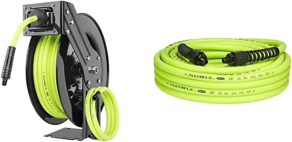 Flexzilla Open Face Retractable Air Hose Reel, 3/8 in. x 50 ft, Heavy Duty, Lightweight, Hybrid, ZillaGreen - L8611FZ & Pro Air Hose, 3/8 in. x 50 ft, Heavy Duty, Lightweight, Hybrid, ZillaGreen
