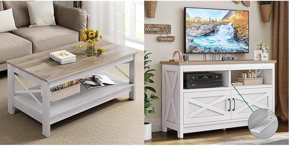 YITAHOME Coffee Table for Living Room,Modern Farmhouse Coffee Table with Storage, TV Stand w/Power Outlet, Farmhouse Entertainment Center for up to 40 Inch TV, Wood Living Room Table, X-Shape Design