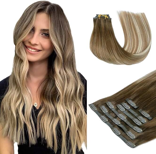 HOTBANANA Clip in Hair Extensions 22 inch 150g 7pcs Walnut Brown to Ash Brown and Bleach Blonde Clip in Remy Human Hair Extensions Straight Hair Invisi Edge Clip Hair Full Head