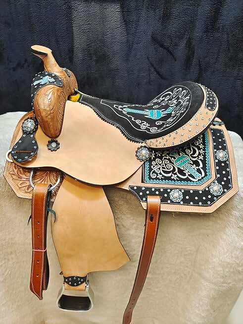 Classic Quality Premium Leather Comfort Western Barrel Racing Trail Equestrian Horse Saddle TACK, Headstall, Breast Collar & REINS Size 15-17 (17" inches Seat, Blue EMBROIEDRY)