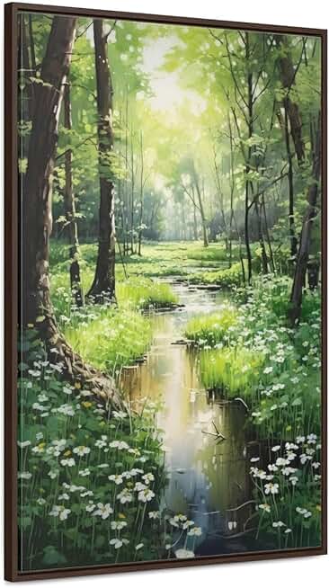 Framed Sunlit Forest Glade Watercolor Painting: Peaceful Nature Scene, Lush Greens, Earthy Colors, Wildflowers, Canvas Print Home Decor 24″ x 36″