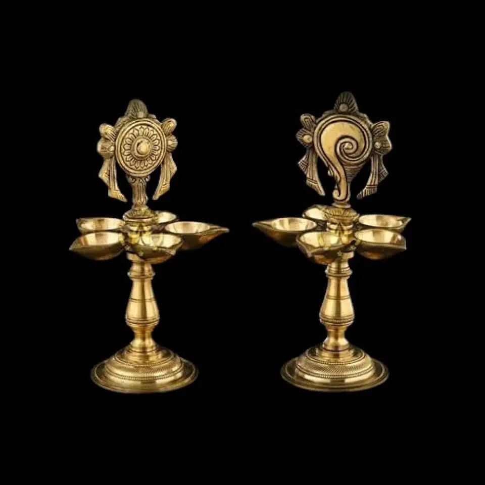 Brass Shangh & Chakra Antique Diya Set - Traditional Brass Vilakku, Kerala Lamp