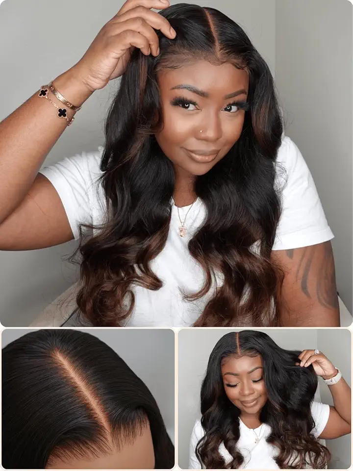 Nadula Bye Bye Knots Glueless Body Wave Wig Ombre Highlight Loose Wave Lace Front Wig Human Hair Pre Plucked, 7x5 HD Pre Cut Lace Ombre Brown Wig with Highlights Ready to Wear Wig 150% Density 24inch