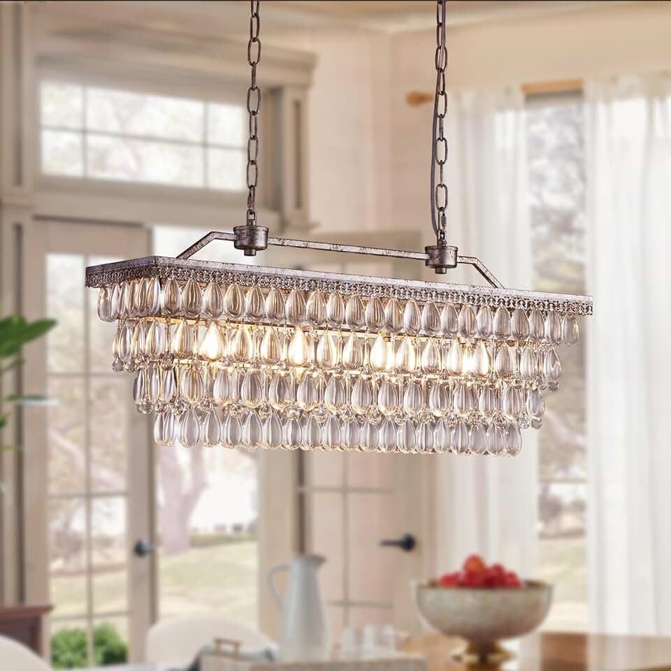Wellmet Dining Room Crystal Chandelier, 30 Inch Antique Silver Rectangle Chandeliers Over Table, 4 Lights Farmhouse Kitchen Island Lighting, Vintage Crystal Chandelier Light Fixture for Living Room