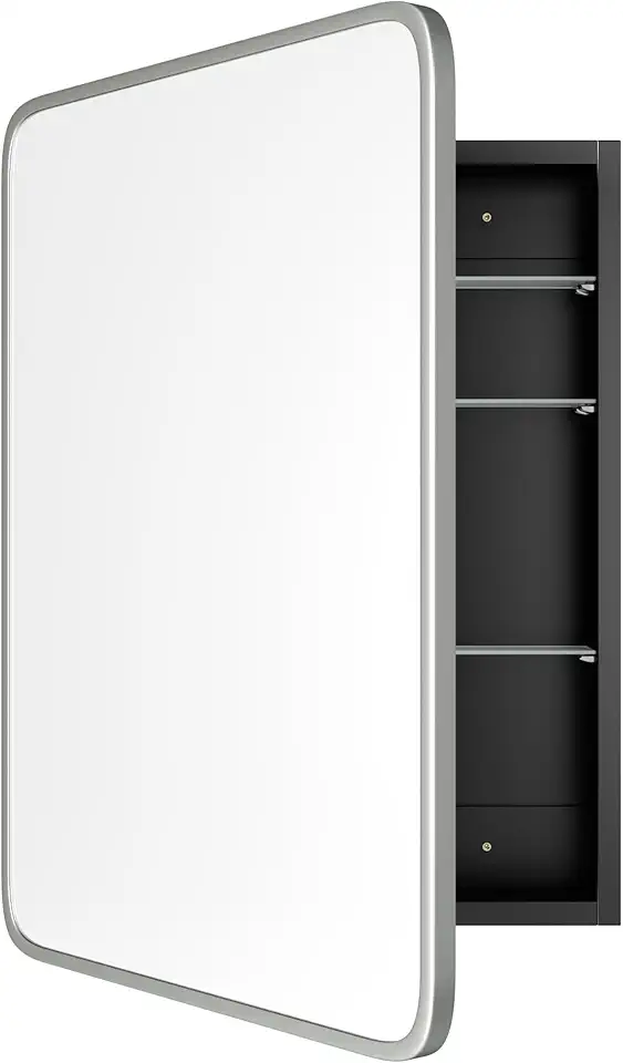 Bathroom Wood Black Cabinet with 20''x30'' Brushed Nickel Metal Frame Curved Mirror, Recessed Medicine Cabinet, Bathroom Storage Cabinet