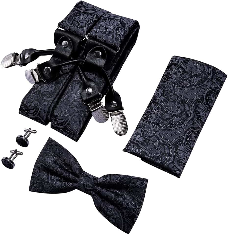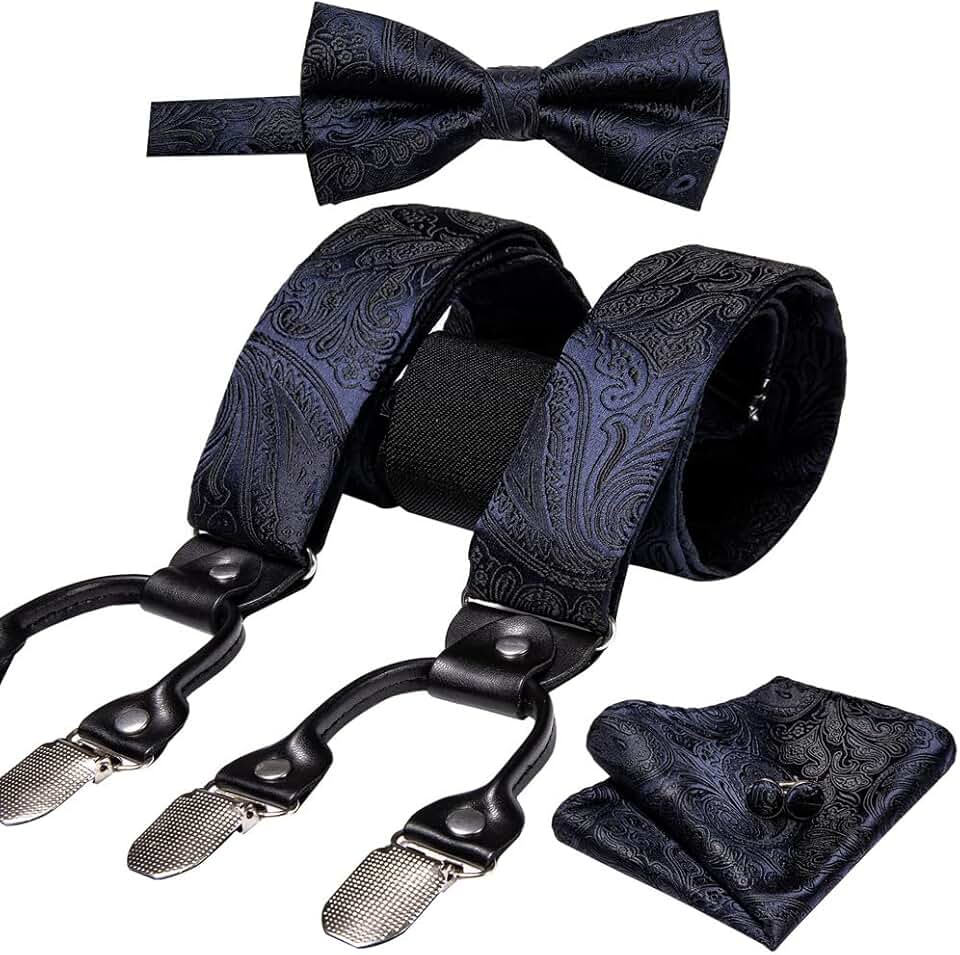 Suspender for Men Silk Bowtie Set Cufflinks Elastic Wedding Suspender 6 Clips Bow Tie for Party