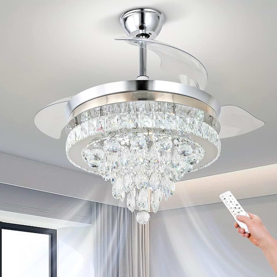 Finktonglan 42” Modern Crystal Fandelier Ceiling Fan with Lights Remote Control Retractable Ceiling Fan with Light LED Flush Moun Chandelier Ceiling Fan for Dining Room Living Room Bedroom