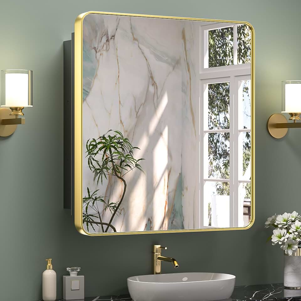 30 x 32 Inch Medicine Cabinets for Bathroom with Mirror Adjustable Shelves Stainless Steel Framed Single Door Modern Farmhouse Metal Recessed Wall Mounted Gold Bathroom Storage Cabinets
