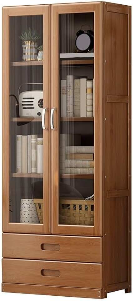 LITFAD 4-Tier Freestanding Bookcase with Glass Doors Bamboo Bookshelf with 2 Drawers Modern Display Storage Cabinet for Bedroom, Living Room, Office, Library,31.5" L x 12" W x 63" H