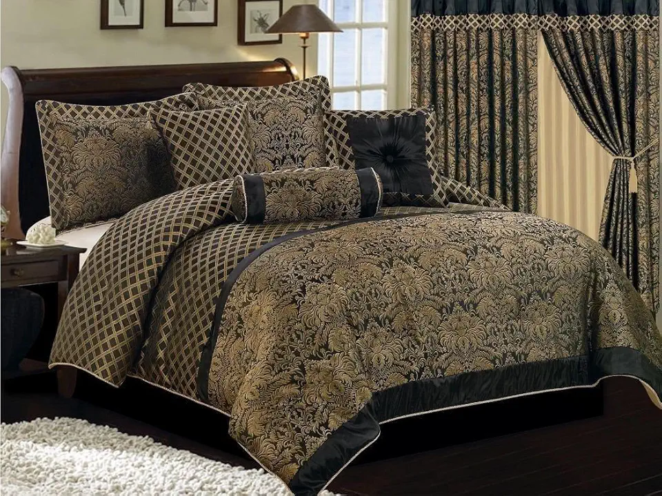 Collection Lisbon 7Pcs Jacquard Floral Comforter Set Cal King Black/Gold