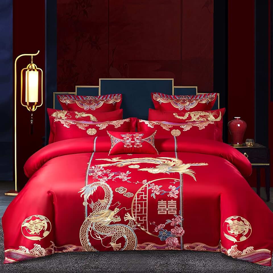 Chinese Wedding Bedding Sets Dragon and Phoenix Bird Embroidery Red Wedding Duvet Cover Set 100S Long-Staple Cotton Embroider Luxury Red Wedding Bedding Sets(Color 9 Queen,6PC/Set)