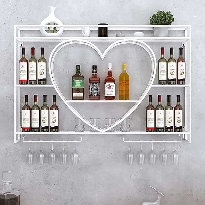 Modern Metal Wall Mounted Wine Display Rack Hanging Industrial Wine Racks, with Shelves Heart Shape Wine Holder Shelves for Liquor Bottles Glass Rack Iron Display, Stand for Home Restaurant Bars(White