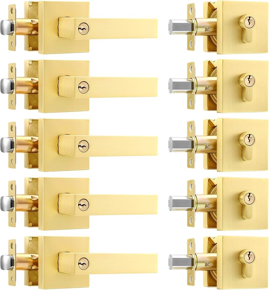 5 Pack Leydebong Heavy Duty Entrance Lever Door Handle for Office and Front Door Reversible for Right and Left Side Single Keyed Square Deadbolt Lock Satin Brass Finish