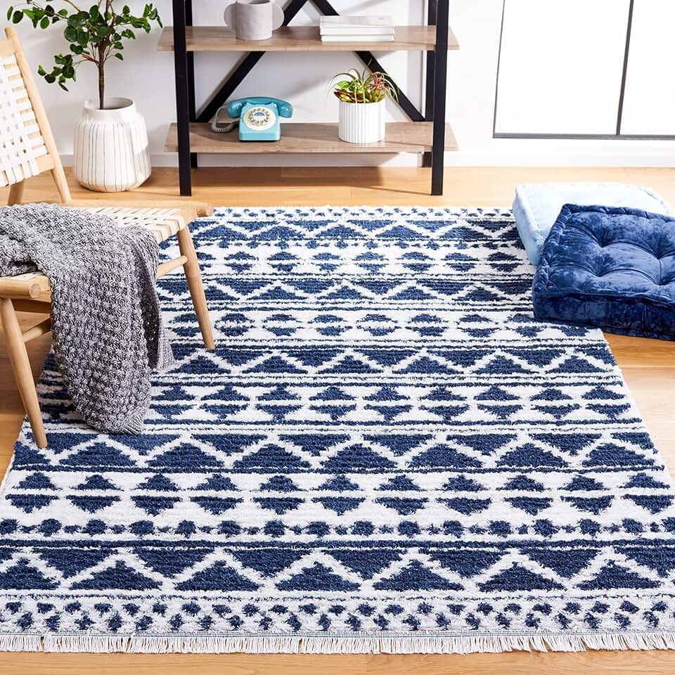 Safavieh Augustine Collection Area Rug - 9' x 12', Navy & Ivory, Moroccan Boho Rustic Fringe Design, Non-Shedding & Easy Care, Ideal for High Traffic Areas in Living Room, Bedroom (AGT847N)