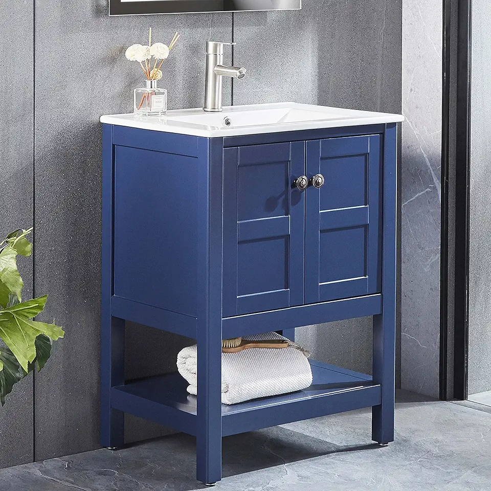 24" Solid Wood Bathroom Vanity and Sink Combo White Undermount Vessel Ceramic Sink, Modern Wood Bathroom Storage Cabinet with 2 Doors (Navy)