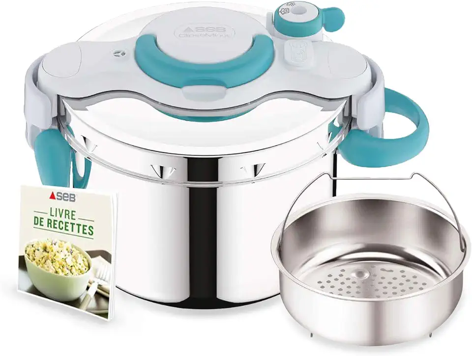 Seb ClipsoMinut Easy + Blue 9L Folding Handles Cocotte-minute® Induction Book of 100 Recipes Stainless Steel Cooking Pot Made in France Easy to use, Made in France