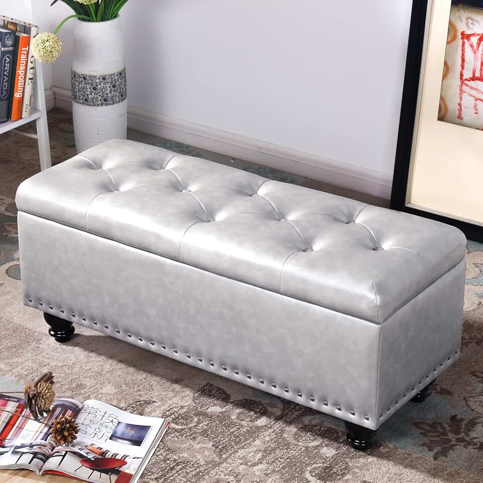 Large Storage with Wooden Legs,Clothing Toys Storage Bench for Bedroom Entryway Load 350lbs,Leather Button Tufted Footstool with Storage-Grey 60x40x43cm(24x16x17inch)